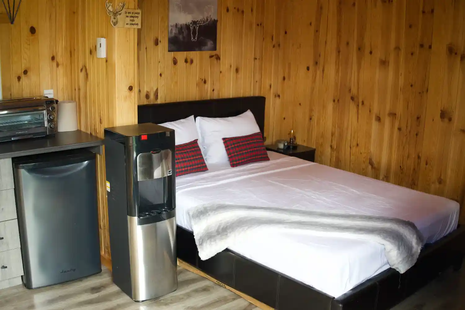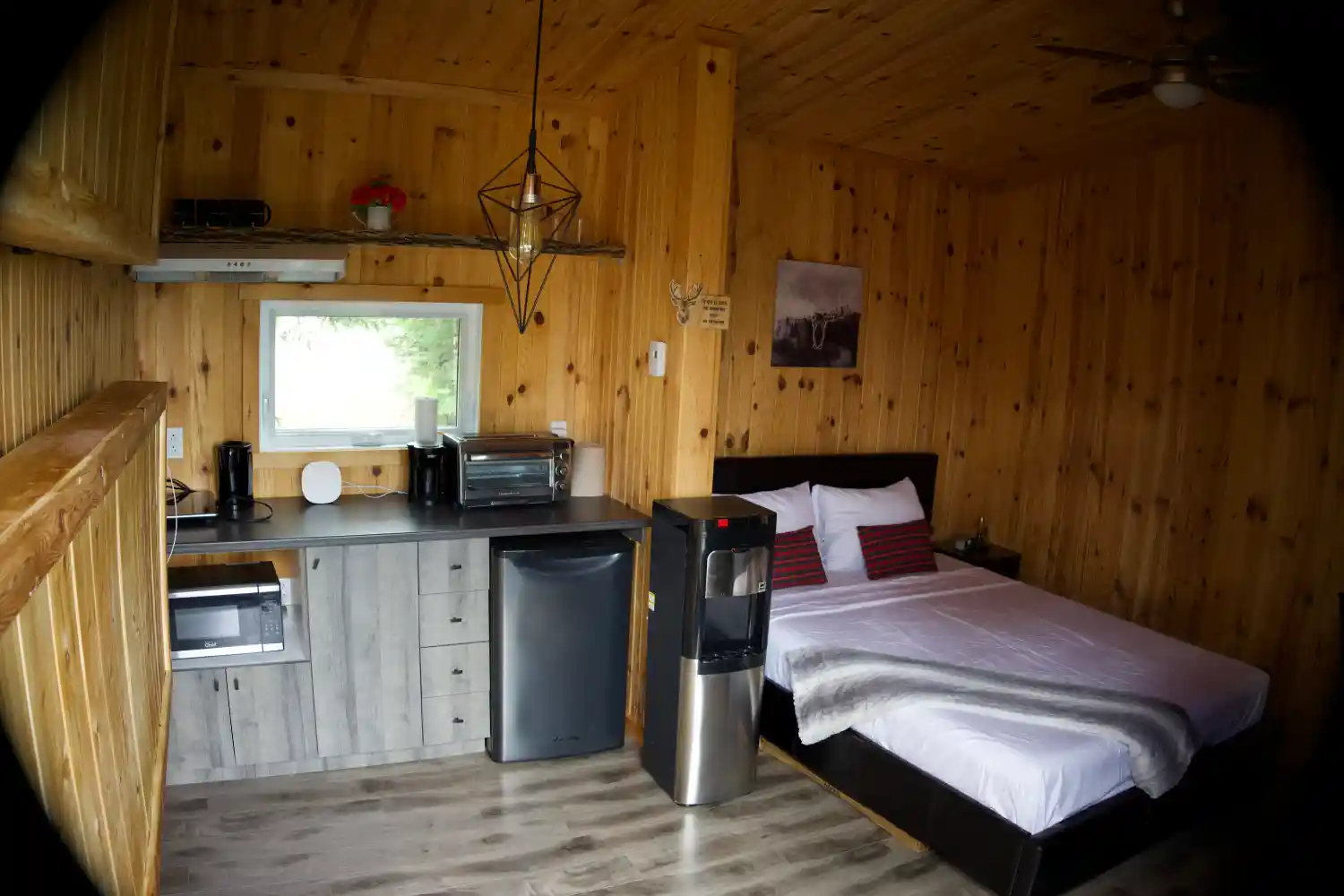 - Équipements : , chauffage, Distributeur d’eau (chaude et froide), éclairage, Foyer extérieur, Mini-four et micro-ondes, Mini-Fridge and induction, petite poêle, Spa, Table et chaise, toilettes sèches, TV, Vaisselles et bouilloire, ventilateur, Wi-Fi