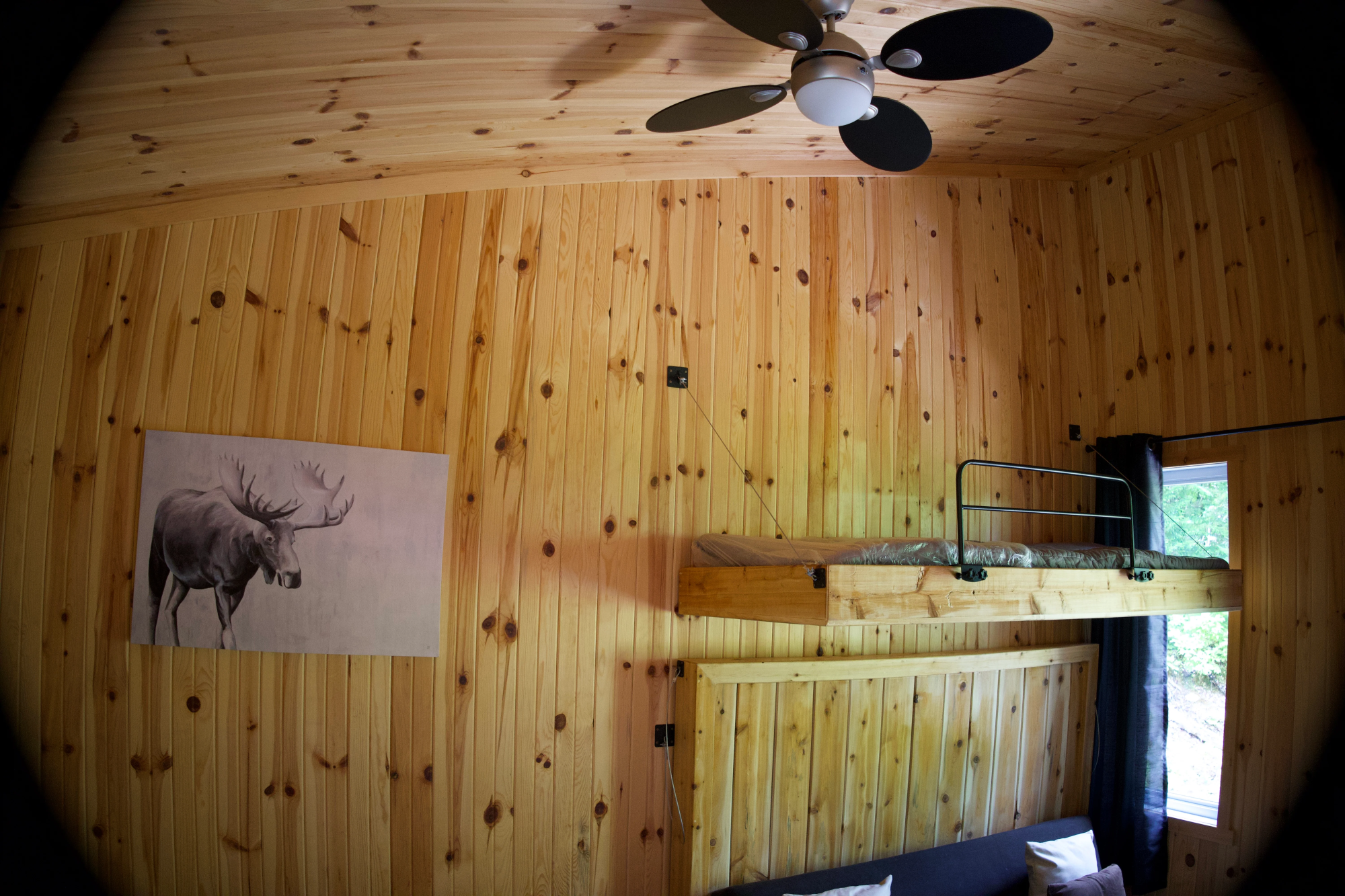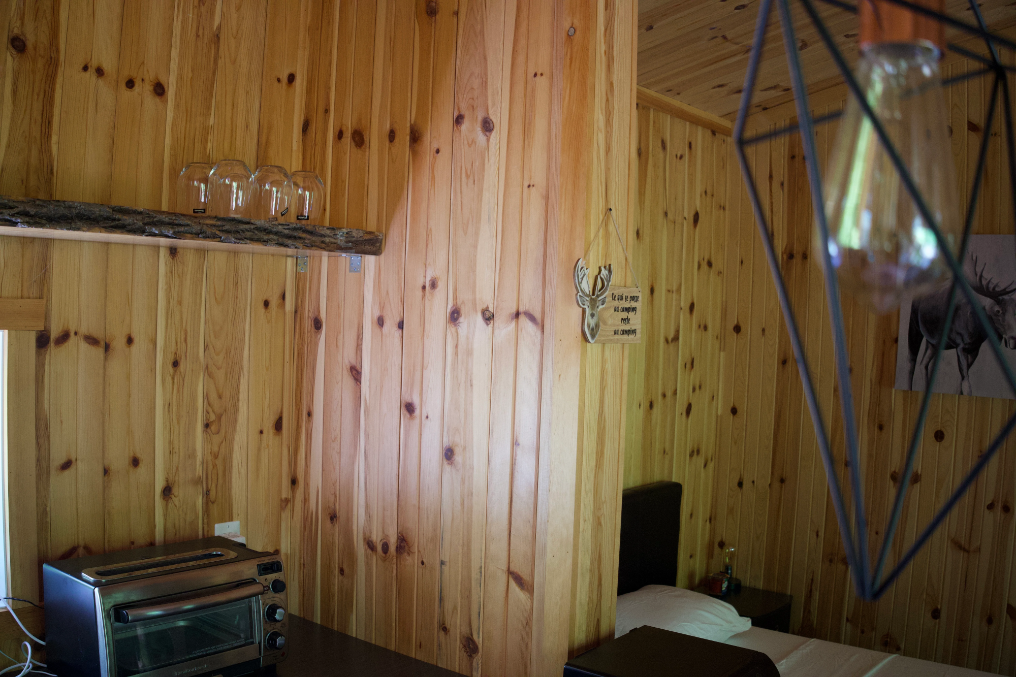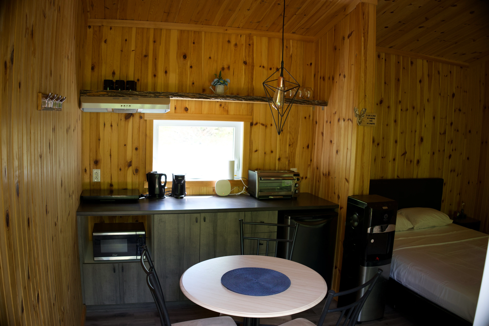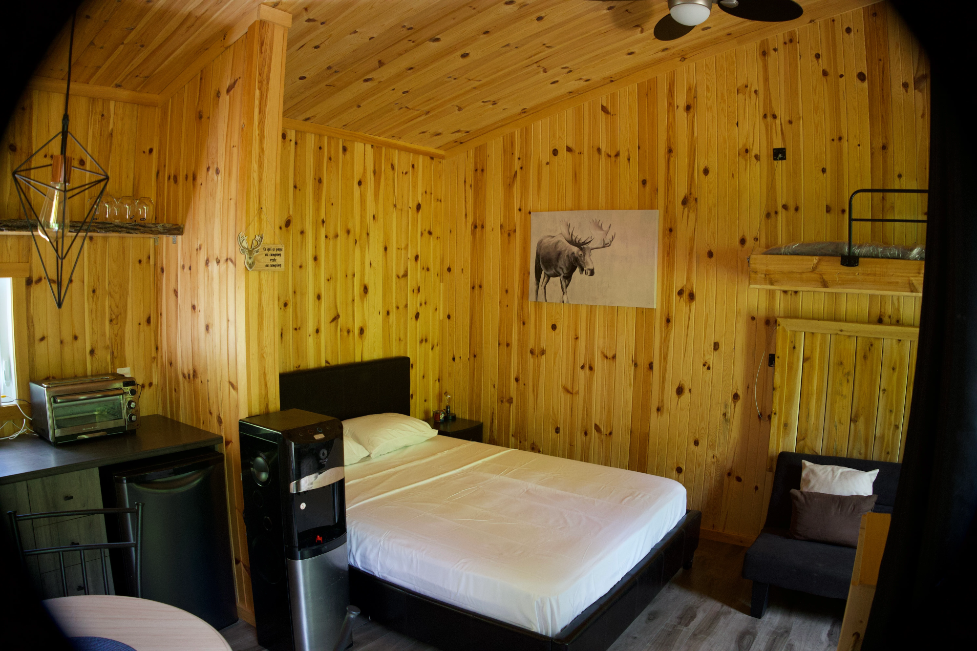 Equipé de toilettes sèches, d’un mini-réfrigérateur, d’un petit poêle, d’un barbecue, de l’éclairage, d’un ventilateur et du chauffage, ce chalet a tout ce qu’il faut pour vous sentir comme chez vous en pleine nature. Son intérieur chaleureux vous invite à la détente, tandis que le cadre extérieur invite à l’exploration et aux jeux.